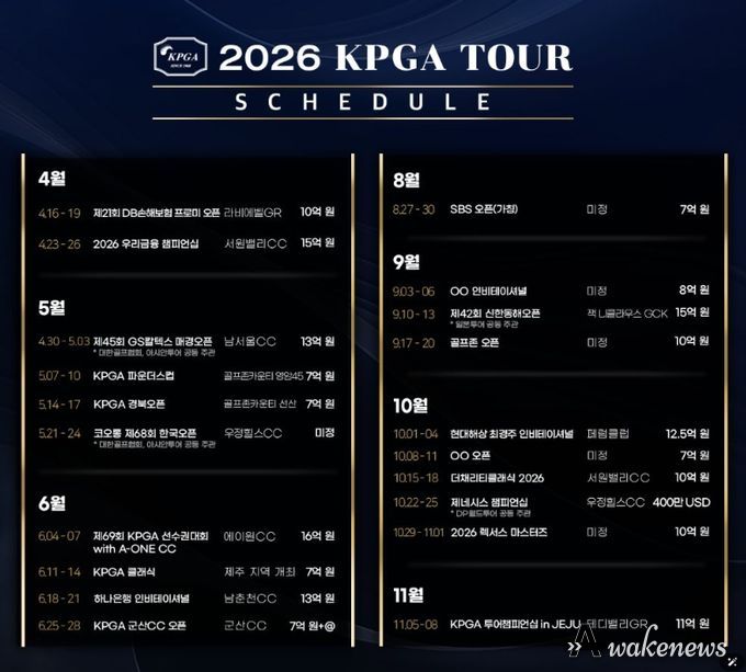 어웨이크뉴스 오경하 기자 | ㈜한국프로골프투어(대표이사 김원섭, 이하 KPGT)가 3월 5일, 2026 시즌 KPGA 투어 일정을 발표했다.