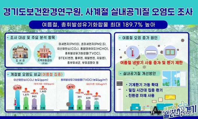 지난해 일 년간 동일 지점에서 실내 공기질 오염물질을 조사한 결과, 여름철 이산화탄소 평균 농도는 1,743ppm으로, 봄철(1,071ppm) 대비 62.8%, 가을철(965ppm) 대비 80.6%, 겨울철(1,443ppm) 대비 20.8% 높았다. 여름철 총휘발성유기화합물 평균 농도는 872μg/m³로, 봄철(391μg/m³) 대비 122.9%, 가을철(329μg/m³) 대비 164.9%, 겨울철(301μg/m³) 대비 189.7% 높게 나타났다.