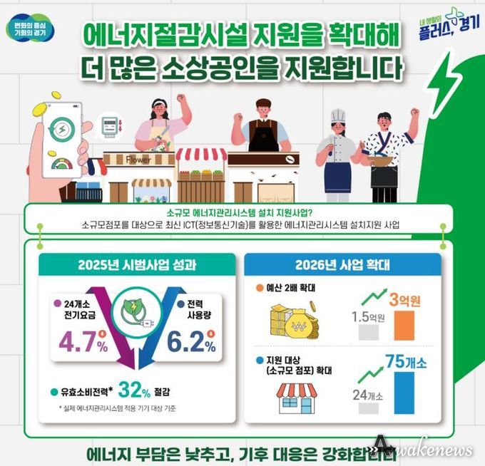 어웨이크뉴스 오경하 기자 | 경기도가 소상공인이 전기요금 부담을 덜 수 있도록 정보통신기술(ICT)을 활용해 에너지 효율을 높이는 ‘소규모시설 에너지관리시스템 설치 지원사업’ 규모를 75곳으로 확대했다.