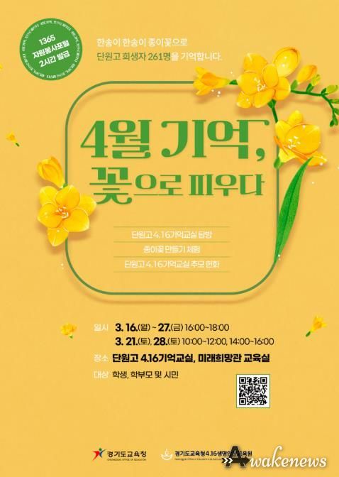 어웨이크뉴스 오경하 기자 | 경기도교육청4.16생명안전교육원이 '4월 기억, 꽃으로 피우다’프로그램 참가자를 모집한다.