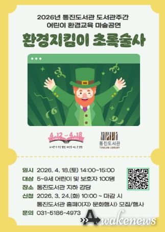 ‘환경지킴이 초록술사’ 공연은 4월 18일 오후 2시부터 3시까지 통진도서관 지하 강당에서 진행된다. 대상은 5~9세 어린이 및 보호자 100명이다. 참여를 원할 경우 3월 24일 오전 10시부터 통진도서관 누리집에서 신청하면 된다.