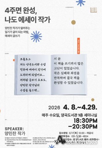 어웨이크뉴스 오경하 기자 | 양곡도서관은 오는 2026년 4월 8일부터 4월 29일까지 매주 수요일 오후 6시 30분부터 8시 30분까지, 총 4회에 걸쳐 '4주면 완성! 나도 에세이 작가' 프로그램을 운영한다고 밝혔다.
