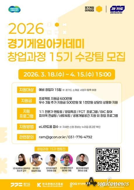 어웨이크뉴스 오경하 기자 | 경기도와 경기콘텐츠진흥원이 대한민국 게임산업의 미래를 이끌어갈 ‘2026 경기게임아카데미’ 창업과정 15기 수강생을 4월 15일까지 모집한다.