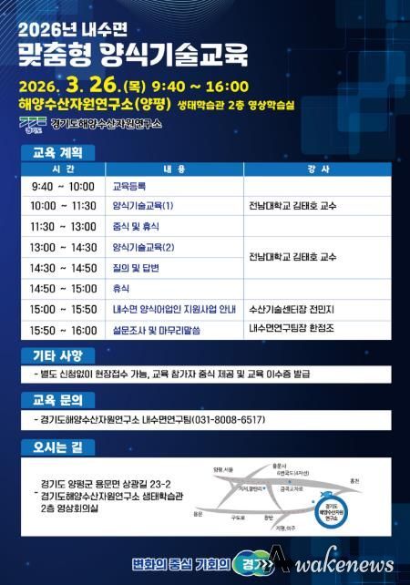 어웨이크뉴스 오경하 기자 | 경기도해양자원연구소는 오는 26일 양평에 있는 연구소 생태학습관에서 내수면 양식 어업인의 역량 강화를 위한 양식기술교육을 실시한다.
