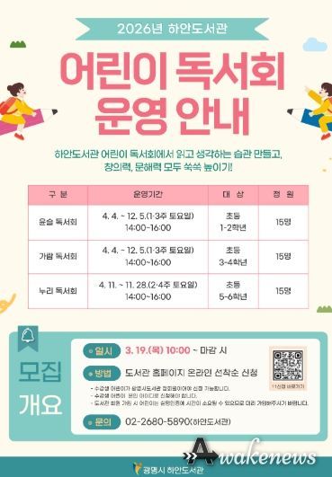 어웨이크뉴스 오경하 기자 | 광명시 하안도서관은 어린이들이 올바른 독서 습관을 형성하고 기초 문해력을 기를 수 있도록 ‘2026년 어린이 독서회’ 참여 회원을 모집한다.
