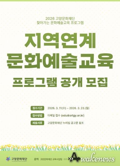 어웨이크뉴스 오경하 기자 | 고양문화재단은 지역의 다양한 문화적 자원과 오늘의 삶을 예술로 풀어내는 '지역연계 문화예술교육 프로그램'을 공개 모집한다고 18일 밝혔다.