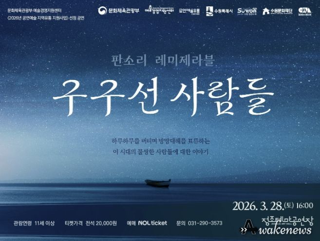 수원문화재단은 정조테마공연장에서 오는 28일 오후 4시, 문화체육관광부와 예술경영지원센터의 ‘2026 공연예술 지역유통 지원사업’ 선정작인 ‘판소리 레미제라블 '구구선 사람들'’을 선보인다.