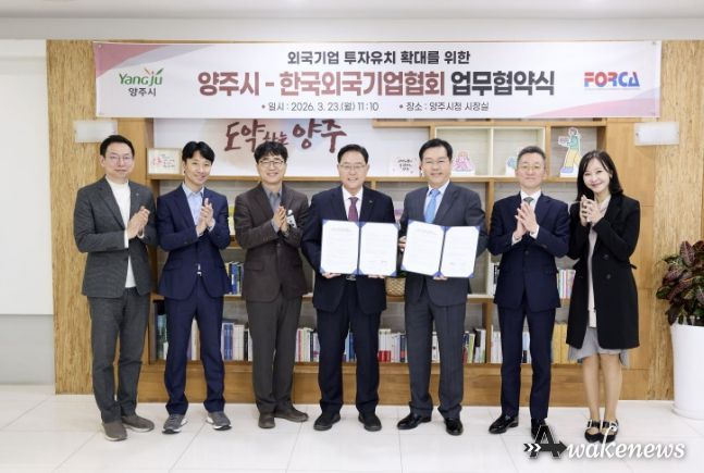 어웨이크뉴스 오경하 기자 | 양주시가 지난 23일 시장실에서 외국기업 투자유치 확대를 위해 양주시와 한국외국기업협회(회장 문고영) 간 업무협약을 체결했다.