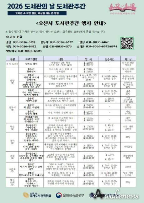 어웨이크뉴스 오경하 기자 | 오산시는 2026년 도서관의 날(4월 12일)과 도서관주간(4월 12일~4월 18일)을 맞아 시민 누구나 참여할 수 있는 다양한 독서문화 행사를 운영한다고 밝혔다.