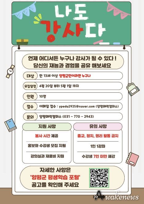 어웨이크뉴스 오경하 기자 | 양평군은 주민들의 숨은 재능을 발굴하고 함께 배우는 즐거움을 나누기 위해 2026년 상반기 ‘나도 강사다’ 프로그램에 참여할 주민 강사를 모집한다고 밝혔다.