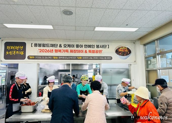 어웨이크뉴스 오경하 기자 | 평택팽성노인복지관은 3월 26일, ‘용봉월드재단, 오케이 좋아 연예인 봉사단’의 후원과 재능기부 활동으로 ‘행복가득 짜장데이, 특별공연’을 성황리에 개최했다. 이번 행사는 지역사회 후원과 연예인 재능기부를 기반으로 어르신들에게 무료 식사와 문화예술 공연을 제공하여 정서적 즐거움과 문화 향유 기회를 확대하고, 지역사회 나눔 문화를 확산하기 위해 마련됐다.