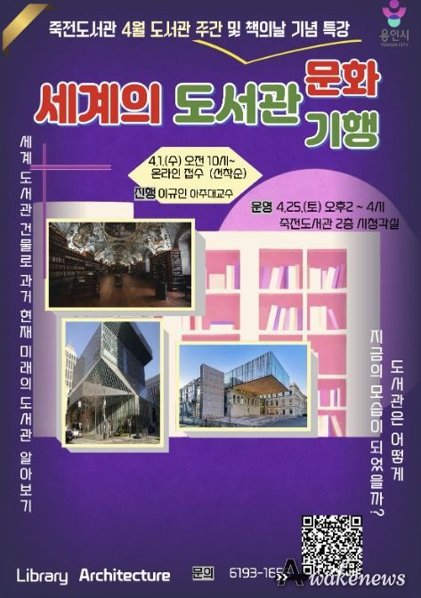 어웨이크뉴스 오경하 기자 | 용인특례시 죽전도서관은 4월 도서관 주간을 맞아 인문학 기념특강 ‘세계의 도서관 문화기행’을 개최한다.