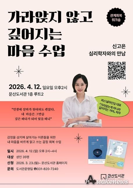 어웨이크뉴스 오경하 기자 | 파주시 문산도서관은 오는 4월 12일, 성인을 대상으로 한 감정 회복 강연 ‘가라앉지 않고 깊어지는 마음 수업’을 운영한다.