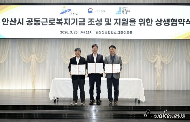 어웨이크뉴스 오경하 기자 | 안산시는 지난 26일 안산상공회의소 그레이트홀에서 경기지방고용노동청 안산지청, 안산시 공동근로복지기금 1호 법인과 함께 ‘안산시 공동근로복지기금 조성 및 지원을 위한 상생협약’을 체결했다고 27일 밝혔다.