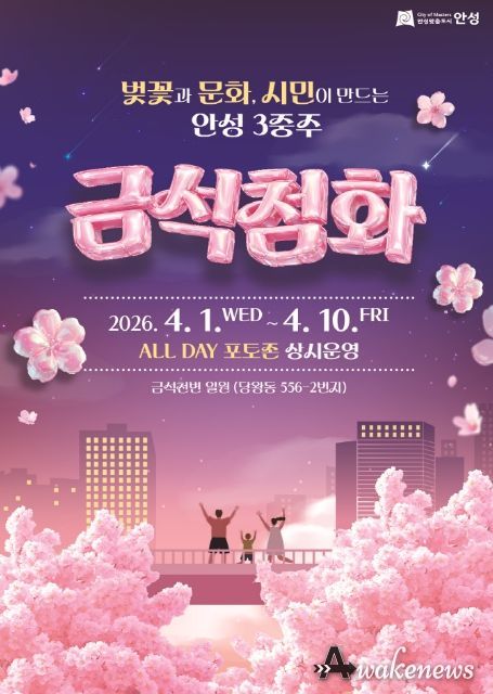어웨이크뉴스 오경하 기자 | 안성시는 오는 4월 1일부터 10일까지 봄의 전령사인 벚꽃 개화 시기에 맞춰 금석천 일대에 시민들을 위한 금석첨화(金石添花)벚꽃 포토존을 집중 운영한다고 밝혔다.