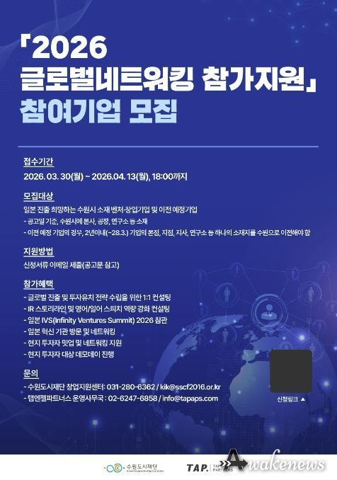 어웨이크뉴스 오경하 기자 | 수원특례시가 ‘2026 글로벌네트워킹 참가지원’에 참여할 벤처·창업 기업 7개사를 3월 30일부터 4월 13일까지 모집한다.