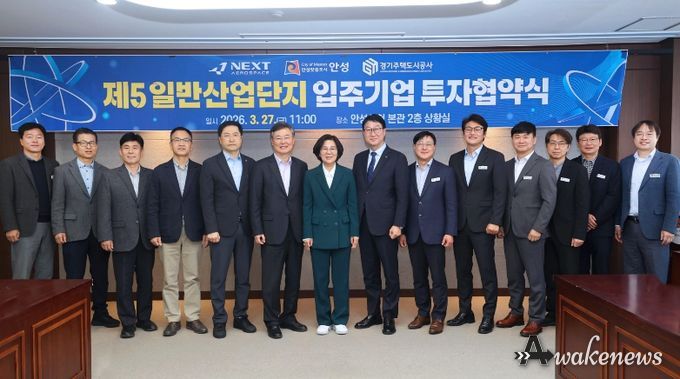 어웨이크뉴스 오경하 기자 | 안성시는 2026년 3월 27일 시청 본관 2층 상황실에서 ㈜넥스트에어로스페이스와 ‘제5 일반산업단지 입주기업 투자유치 양해각서(MOU)’를 체결했다. 이번 협약을 통해 (주)넥스트에어로스페이스는 제5 일반산업단지에 총 254억 원을 투자하고 123명의 신규 고용을 창출하기로 했으며, 안성시는 산단 적기 조성과 기업 입주를 위한 행정적 지원을 아끼지 않기로 합의했다.