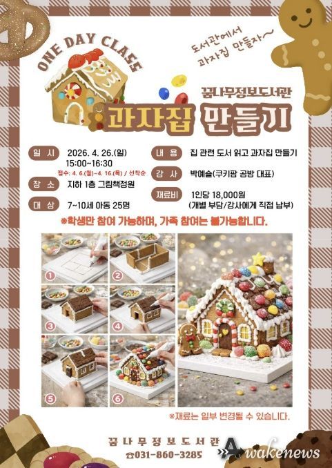 동두천시 도서문화사업소 꿈나무정보도서관에서는 이런 관심에 맞춰 오는 4월 26일 오후 3시부터 4시 30분까지 지하 1층 그림책정원에서‘책 읽고 과자집 만들기’ 일일 강좌(원데이 클래스)를 연다. 참가 신청은 4월 6일부터 선착순으로 진행되며, 모집 인원은 7세부터 10세까지의 아동 25명이다.