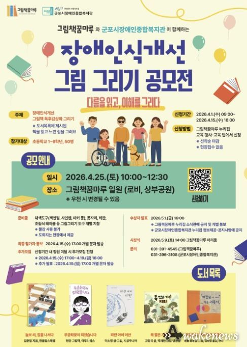 어웨이크뉴스 오경하 기자 | 군포 그림책꿈마루와 군포시장애인종합복지관이 공동 주관하는 장애인식 개선 그림그리기 공모전이 오는 4월 25일(토) 10시부터 그림책꿈마루 로비 및 상부공원에서 진행될 예정이다.