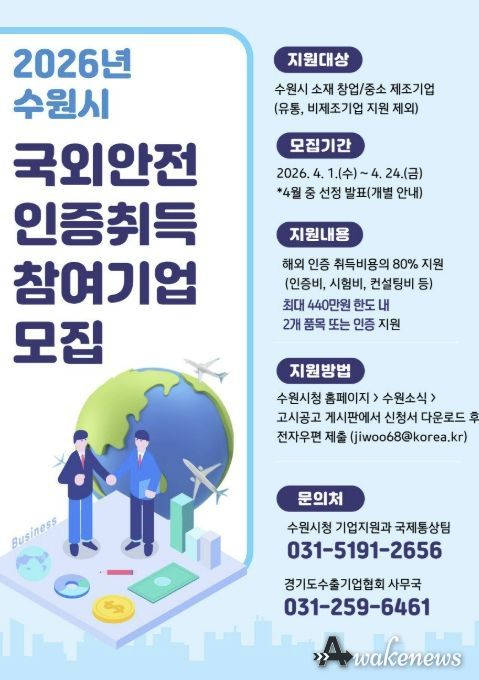 수원시는 24일까지 ‘2026년 국외 규격인증 취득 지원사업’에 참가할 창업·중소·제조기업 8개 업체를 모집한다.