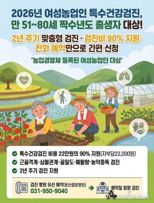 어웨이크뉴스 오경하 기자 | 파주시는 여성농업인의 건강권 보호와 농작업 질환 예방을 위해 ‘여성농업인 특수건강검진 지원사업’을 대폭 확대해 추진한다.