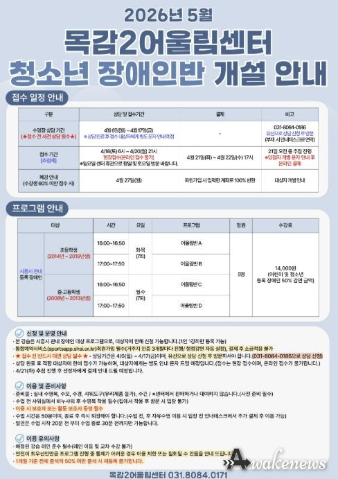 프로그램 접수는 4월 18일 6시부터 4월 20일 21시까지 현장 접수를 진행하고, 4월 21일 당첨자에게 개별 안내할 예정이다. 궁금한 사항은 목감2어울림센터로 문의하면 된다.