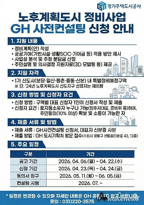 어웨이크뉴스 오경하 기자 | 경기주택도시공사(GH)가 지난해에 이어 노후계획도시 정비사업의 체계적이고 신속한 추진을 지원하기 위해 ‘노후계획도시 정비사업 GH사전컨설팅’을 실시한다고 6일 밝혔다.