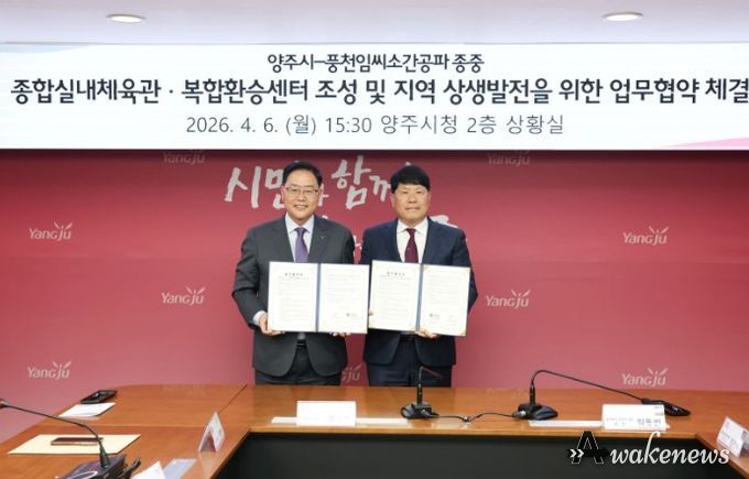 어웨이크뉴스 오경하 기자 | 양주시가 6일 시청 시장실에서 풍천임씨소간공파 종중과 ‘종합실내체육관·복합환승센터 조성 및 지역 상생발전을 위한 업무협약(MOU)’을 체결했다.