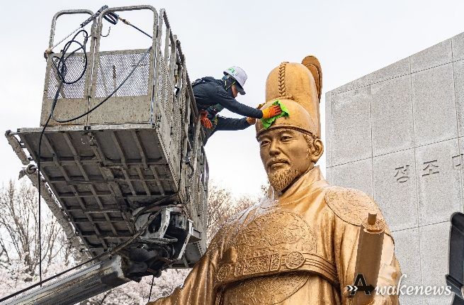 어웨이크뉴스 오경하 기자 | 수원특례시가 봄을 맞아 6일 팔달산에 있는 정조대왕 동상을 세척하고, 주변 환경을 정비했다.