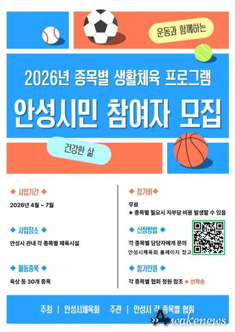 어웨이크뉴스 오경하 기자 | 안성시는 시민 누구나 일상에서 부담 없이 운동을 즐길 수 있도록 ‘2026 종목별 생활체육 프로그램’을 운영하고, 4월부터 참가자를 모집 중이라고 밝혔다.