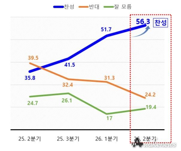 반대(24.2%)와 격차 32.1%까지 벌어져, 찬성 여론 꾸준히 상승