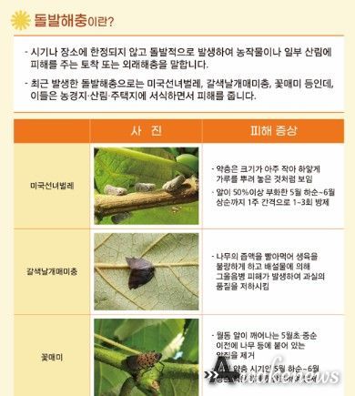 대표적인 돌발 해충으로는 갈색날개매미충, 꽃매미, 미국선녀벌레 등이 있으며, 피해를 최소화하고 확산 방지를 위해 복숭아, 배, 사과, 포도 등 면적 792ha, 1,429호의 농가에 적용 약제를 공급한다.