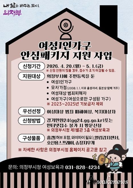 어웨이크뉴스 오경하 기자 | 의정부시는 4월 20일부터 5월 1일까지 12일간 온․오프라인을 통해 여성 1인 가구 안심패키지 지원사업의 신청을 접수한다.