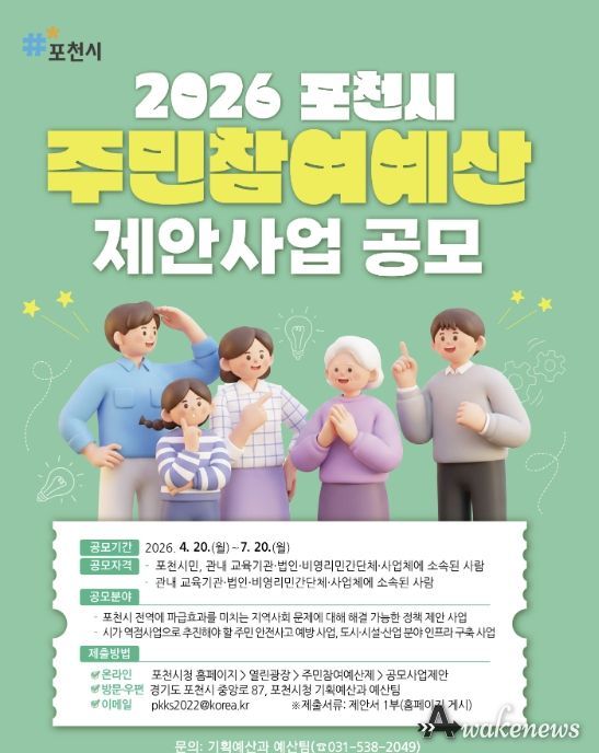 어웨이크뉴스 오경하 기자 | 포천시가 4월 20일부터 오는 7월 20일까지 2027년도 예산편성을 위한 주민참여예산 공모제안사업을 접수하고 있다.