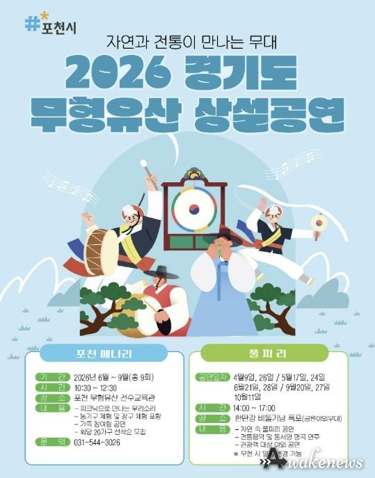 시 관계자는 “이번 상설공연은 포천의 소중한 무형유산이 시민들의 일상 속으로 깊숙이 다가가는 소중한 기회가 될 것”이라며, “앞으로도 우리 시의 유구한 역사와 문화자원을 관광 콘텐츠와 적극 연계하여, 누구나 찾고 싶고 머물고 싶은 ‘품격 있는 인문도시 포천’을 만들어 나가겠다”고 밝혔다.