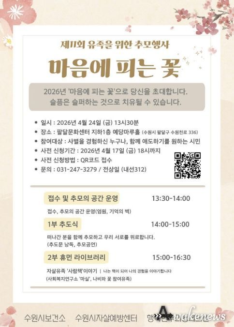 장안구보건소 관계자는 “슬프고 그리운 감정을 자연스럽게 표현하고 나눌 때 비로소 회복과 치유가 시작된다”며 “건강한 애도 문화 형성으로 유족들의 고통을 완화할 수 있도록 추모행사에 많은 관심을 바란다”고 말했다.
