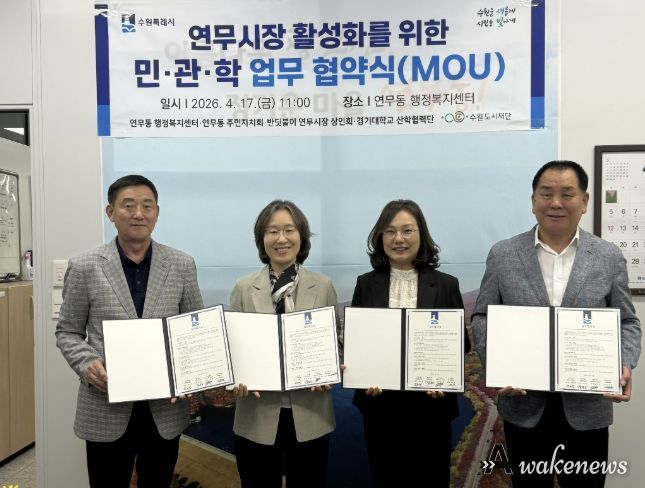 어웨이크뉴스 오경하 기자 | 수원시 장안구 연무동 행정복지센터와 주민자치회, 반딧불이연무시장상인회, 경기대학교 산학협력단은 지난 17일, 각 기관의 긴밀한 상호 협력과 유대관계 강화를 위한 업무협약을 체결했다.
