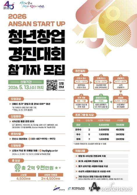 어웨이크뉴스 오경하 기자 | 안산시는 창의적인 아이디어를 보유한 청년 창업가를 발굴하기 위해 내달 13일까지 ‘2026 안산 스타트업 청년창업 경진대회’ 참가자를 모집한다고 24일 밝혔다.