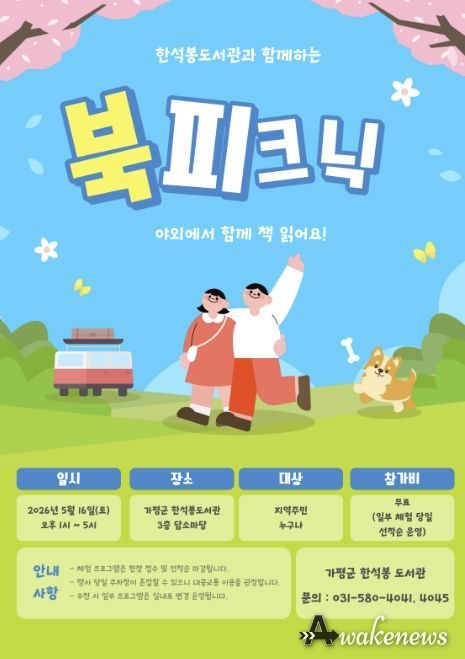 어웨이크뉴스 오경하 기자 | 가평군은 5월 가정의 달을 맞아 오는 16일 한석봉도서관 3층 담소마당에서 ‘가족과 함께하는 북 피크닉’ 행사를 개최한다고 밝혔다.
