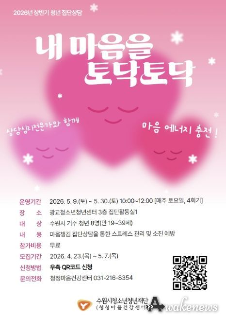 어웨이크뉴스 오경하 기자 | 수원시청소년청년재단 청청마음건강센터는 학업과 취업준비, 직장생활 등 경쟁 중심 환경으로 인해 심리적 소진을 겪는 관내 청년들을 대상으로, 오는 5월 7일까지 전문가가 참여하는 집단상담 프로그램 ‘내 마음을 토닥토닥’ 참가자를 모집한다고 밝혔다.