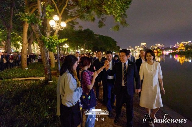 이어 이 대통령 부부는 인근 식당으로 자리를 옮겨 쌀국수와 볶음밥으로 저녁 식사를 함께했다. 이후 호안끼엠 호수 일대를 산책하며 베트남에서의 소중한 추억을 쌓았으며, 산책을 마친 뒤에는 베트남 국민들에게 다시 한번 손을 흔들어 인사를 전하며 일정을 마무리했다.