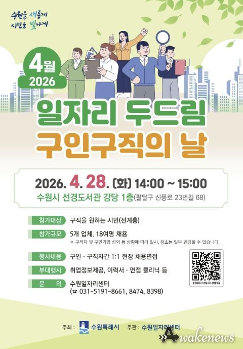어웨이크뉴스 오경하 기자 | 수원특례시는 4월 28일 오후 2시부터 3시까지 선경도서관 강당에서 ‘4월 일자리 두드림 구인·구직의 날’을 개최한다.