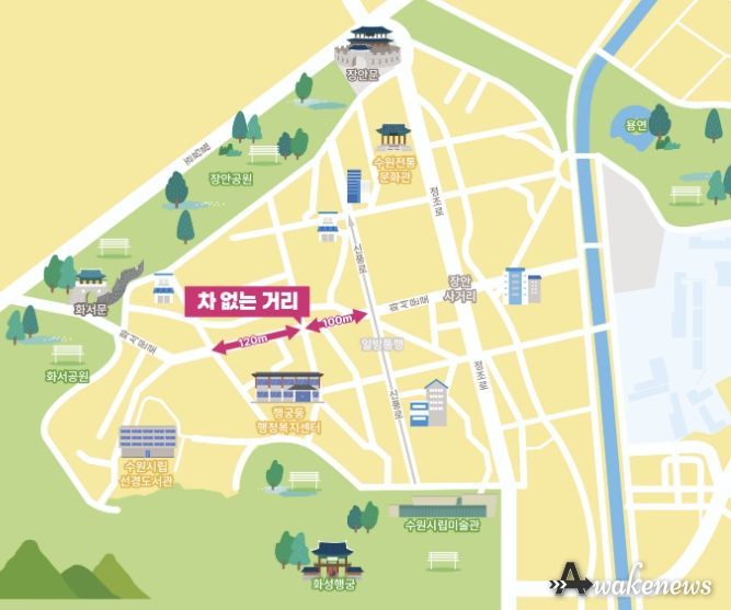 어웨이크뉴스 오경하 기자 | 수원시 행궁동 화서문로 34번지부터 신풍로 47번지까지 약 220m 구간이 5월부터 매주 토요일 ‘차 없는 거리’로 운영된다.