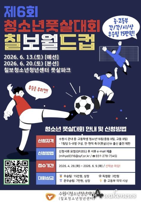 어웨이크뉴스 오경하 기자 | 수원시청소년청년재단 칠보청소년청년센터는 오는 6월 13일(예선)과 20일(본선), 양일간 센터 내 풋살파크에서 녪. 청소년 풋살대회 [제6회 칠보월드컵]’을 개최한다고 밝혔다.